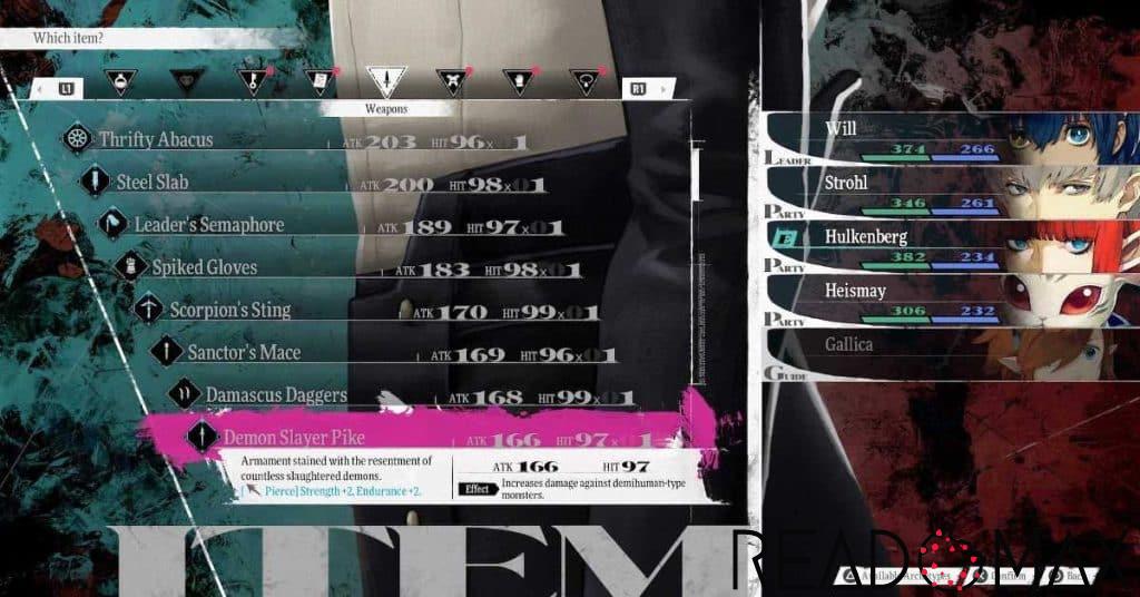 - Starting as the Imp-Ending Pike, this weapon is purified at St. Fermis Church to become the Demon Slayer Pike. The Knight archetype, typically embodied by Hulkenberg, wields it well against demihuman foes. When crafting metaphor refantazio best weapons and game strategies, Knights with this weapon offer high defense and substantial attack power, useful in early game areas with demihuman enemies.